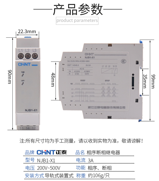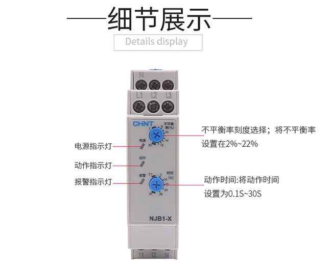 When the phases of a three-phase irreversible device with predetermined phase sequence are connected incorrectly due to maintenance or change of the power supply circuit, the NJB1-X,X1 series will identify the phase sequence, stop supplying power to the power supply circuit and achieve the goal of protecting the device.